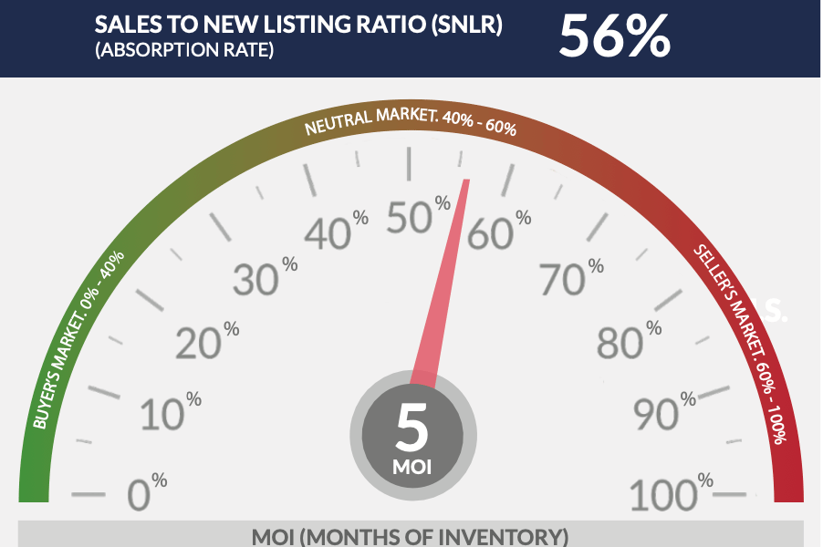 Oakville’s August detached home SNLR (Sales to New Listings Ratio) is at 33% and MOI (Months of Inventory) is at 6.1, which are the same as July.